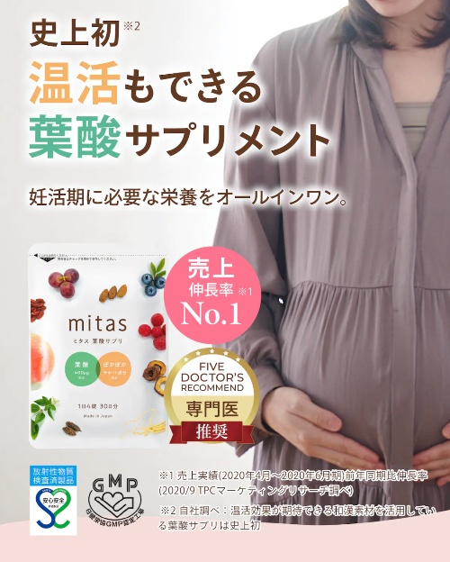 他社の葉酸サプリでは、なかなか温活まで対応している商品はありませんよね。冷えが気になっている方や、これ1つでさまざまな効果を期待したい方は、mitas(ミタス)がおすすめです。