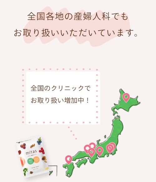 mitas(ミタス)は専門医が監修して作られているだけでなく、妊活におすすめしたい葉酸サプリとして勧められている商品でもあります。全国各地のクリニックで取り扱われているので、気軽に購入しやすいですね。