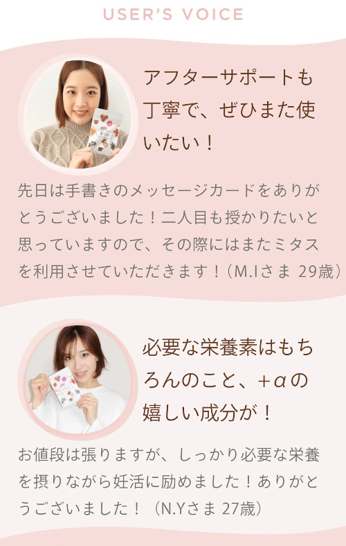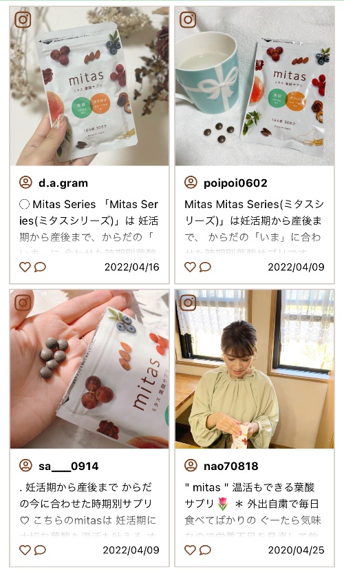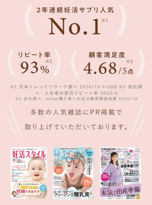 口コミでは、「少しお高めだけど自分と赤ちゃんの体作りのために高品質な葉酸サプリを探して始めた」「ナチュラルな素材を使って作られているから安心感がある!」「冷え対策もしたいからmitas(ミタス)を選んだ」「匂いや味が少なくて飲みやすい」と、高評価が盛りだくさん!