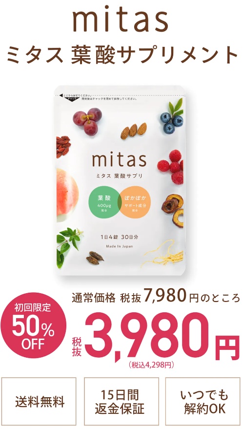体内に取り入れる物なので、やはり安全性も気になりますよね。赤ちゃんのことも考えて、サプリメントはなるべく安全な物を選びたい...。そんな方にはぜひmitas(ミタス)の公式サイトをチェックしてみてほしいんです!